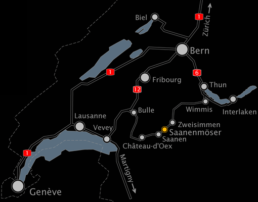 Anreise 1. Autobahn A6 von Bern oder Spiez 2. Abzweigung A6 Richtung Zweisimmen 3. Nach Simmeflue-Tunnel auf Hauptstrasse weiterfahren bis „Zweisimmen“ 4. Kreisel in Zweisimmen bei der 2. Ausfahrt Richtung Saanen/Gstaad verlassen 5. Strasse folgen bis Ortsschild „Saanenmöser“ 6. Nach Ortsschild 3. Haus rechts an der Hauptstrasse Richtung Schönried-Saanen-Gstaad |